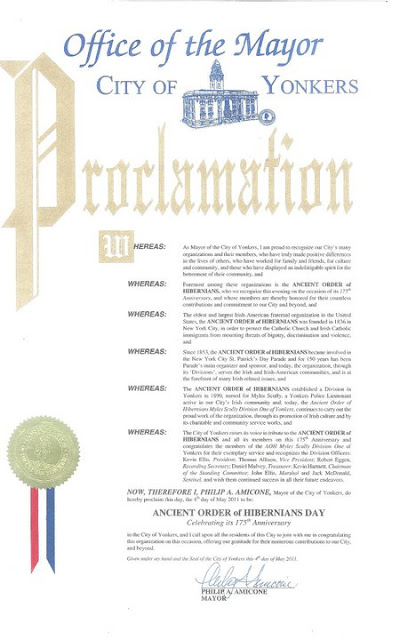 Yonkers Mayor, Philip Amicone for the wonder proclamations. The A.O.H is